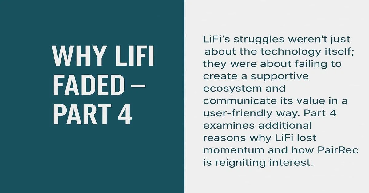 Light Fidelity (LiFi) promised to revolutionize connectivity by transforming beams of light into secure, high-speed wireless networks. Yet despite its brilliance, LiFi stumbled in the marketplace, struggling with consumer adoption, partnerships, and public understanding. In this fourth installment of our series, we explore the deeper reasons behind LiFi’s fade from the spotlight—focusing on trust, consumer accessibility, awareness, marketing missteps, and distribution gaps—while highlighting how PairRec’s Smart Zone strategy is turning those failures into opportunities for a brighter, more connected future.
